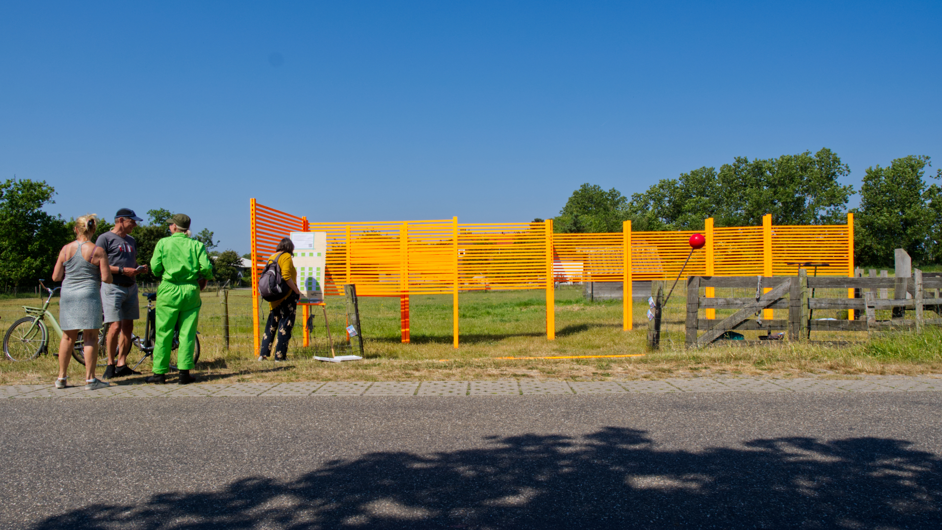 Wij zijn als kunstenaars een actief onderdeel van het kunstwerk. In een bepaald ritme (soms om de paar minuten, soms een kwartier) zullen we een deel van het kunstwerk verplaatsen. Het publiek kan dit ervaren door er doorheen te lopen. Soms zullen ze op een grens stuiten dicht bij de ingang, soms zijn het juist lange zichtlijnen of is er juist een hele intieme en besloten ruimte in de andere hoek van het weiland ontstaan. Het kunstwerk is meerdere keren te bezoeken en zal elke keer een andere ervaring opleveren. Voor de langs fietsende en rijdende mensen geeft het verplaatste kunstwerk elke keer een ander perspectief op het landschap.