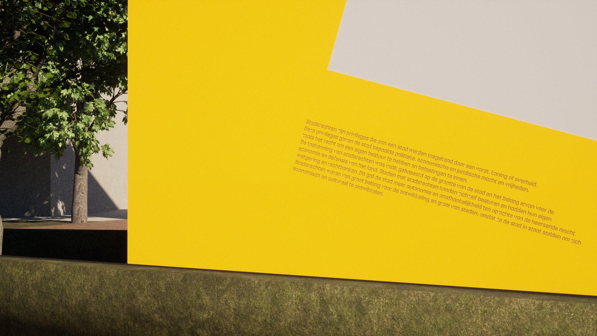 De omgeklapte plattegrond van de pastorie, tegen de blinde gevel bij de ingang van het plein, werkt als een markering voor het gebied. Het is een nieuw herkenningspunt en nodigt uit om naar het plein te gaan. Hierop zijn ook de teksten over de stadrechten 2024 te lezen die we samen met bewoners uit Huissen willen opstellen.